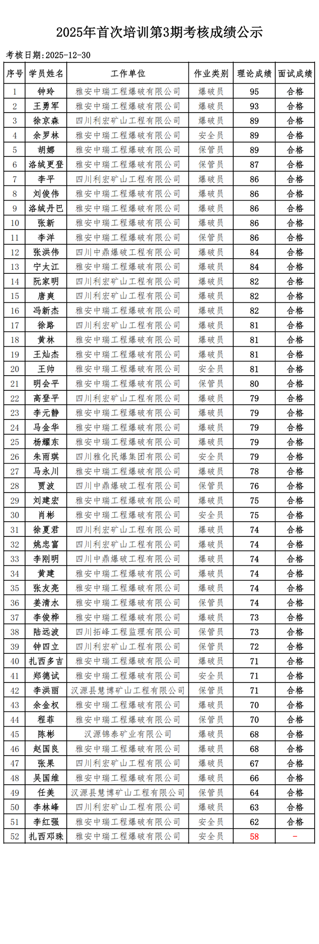 2025年首次培训第3期考核成绩公示